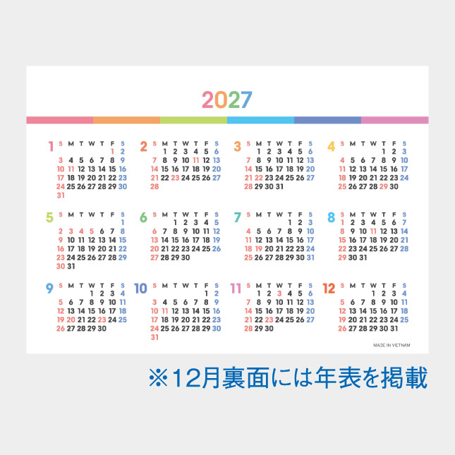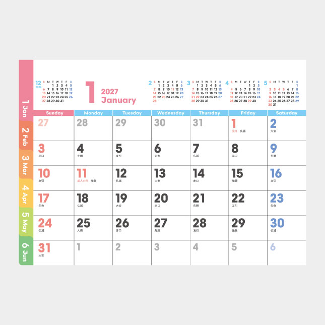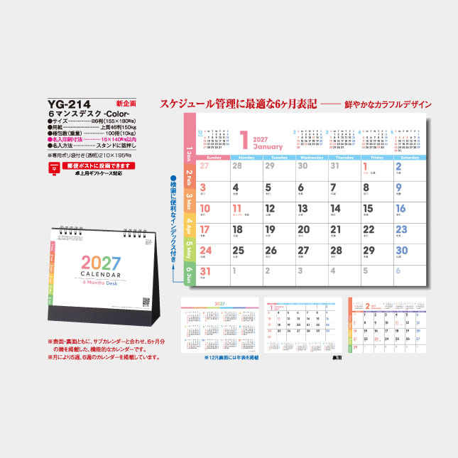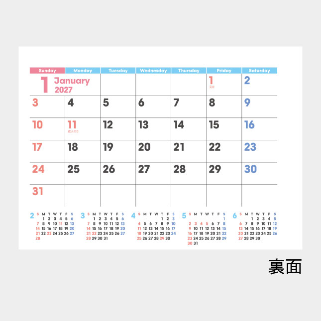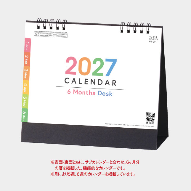 表面・裏面ともに、サブカレンダーと合わせ、6か月分の歴を掲載した、機能的なカレンダーです。