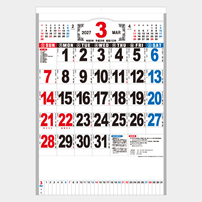 ・大きく見やすい数字、青色で色分けられた土曜日、そして十分にとられたメモスペースは、