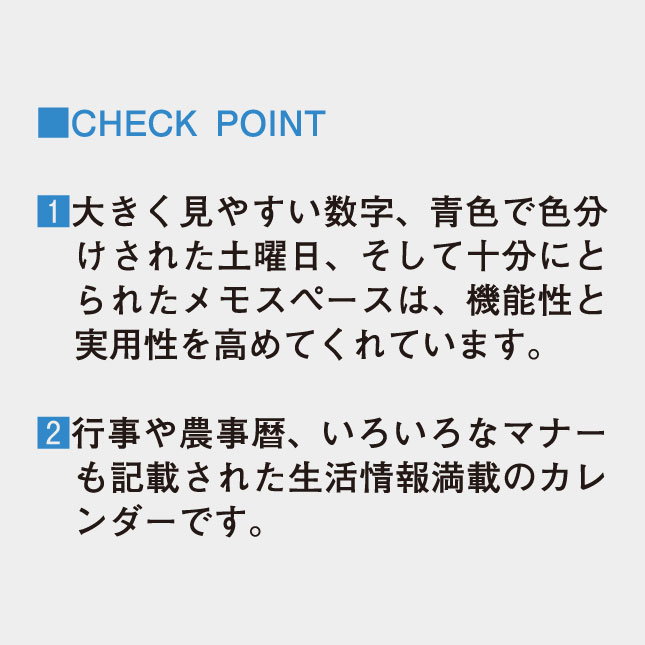 ・行事や農事暦、いろいろなマナーも記載された生活情報満載のカレンダーです。